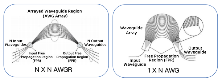 Unlike a static AWG (used only for multiplexing/demultiplexing), an AWGR features specially designed arrayed waveguide phase responses that enable cyclic routing. Its optical characteristics can be dynamically tuned via thermo-optic or electro-optic effects, allowing control over the output paths of different wavelengths.