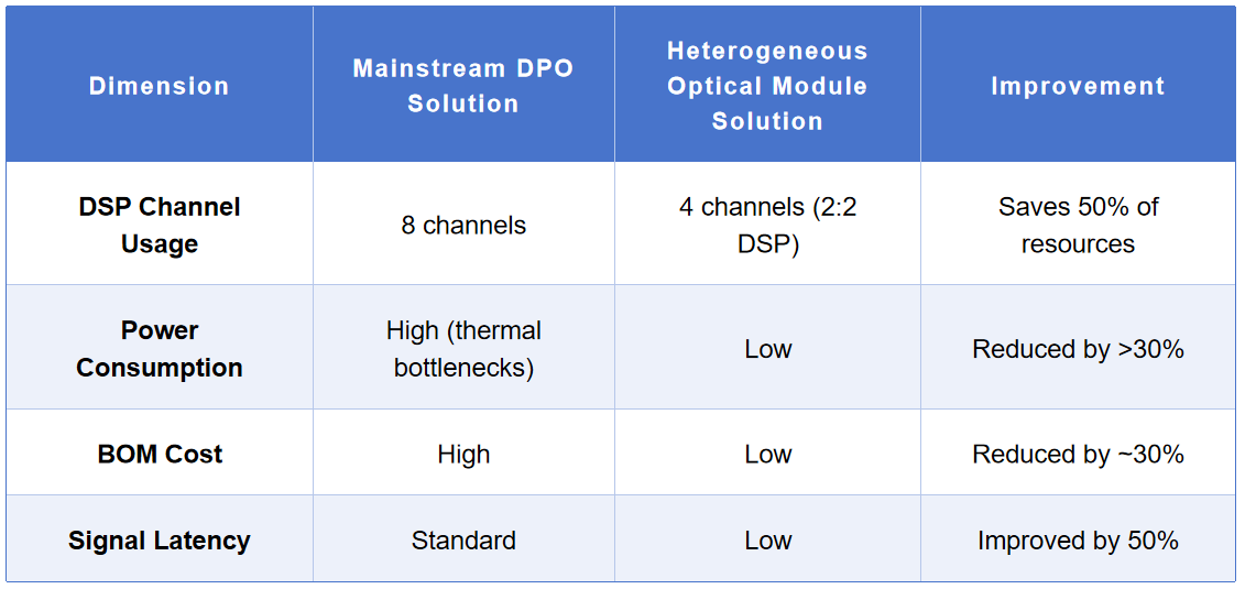 Unlike traditional full-DSP optical modules (DPO), the HYBRID architecture adopts DSP on only half of the channels, significantly reducing power consumption and latency.