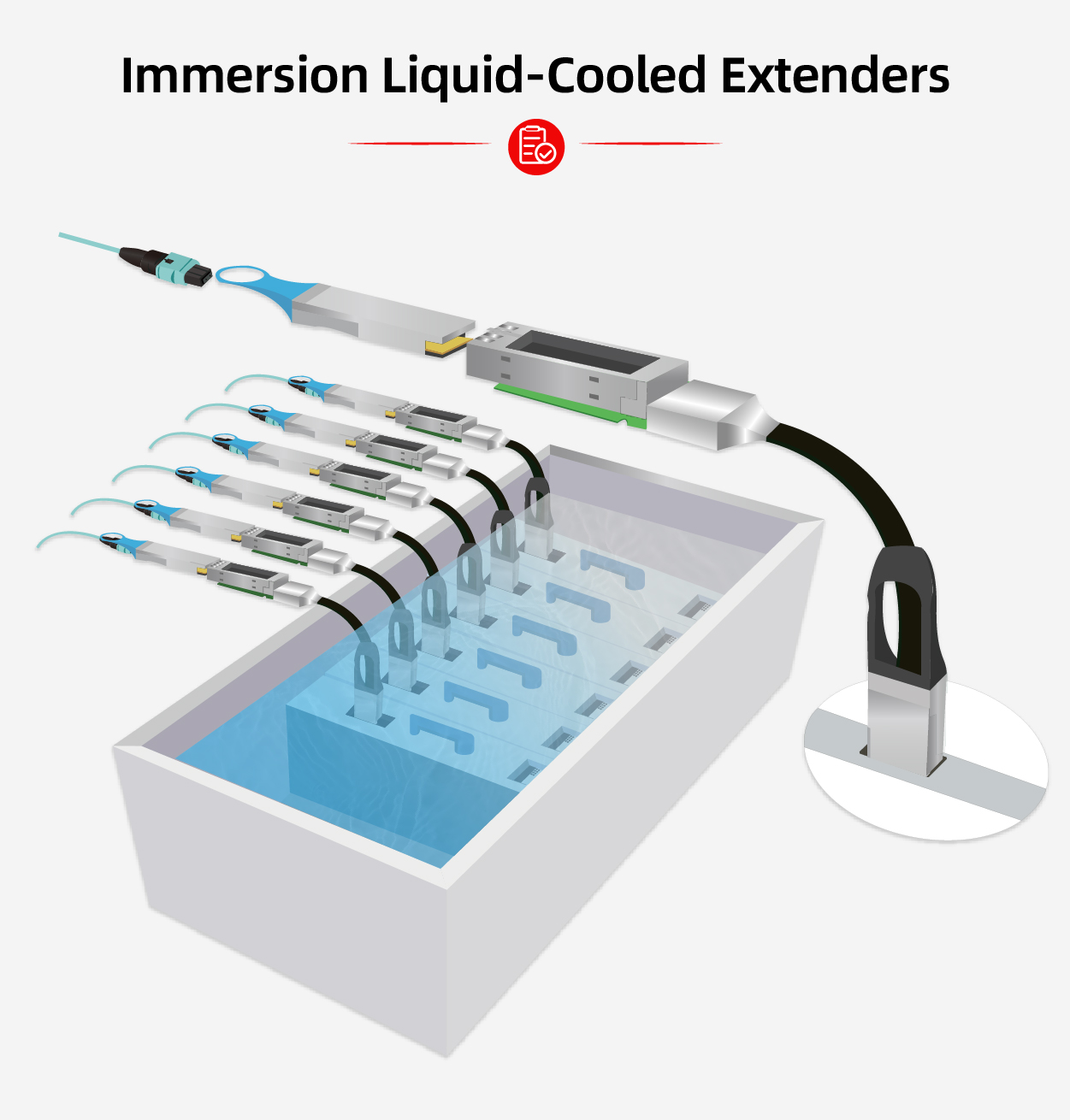 As a leader in optical interconnection technology, Gigalight has successfully built a comprehensive portfolio of liquid-cooled optical interconnection products. The product range includes immersion liquid-cooled optical modules, AOCs and liquid-cooled extenders, which can be widely applied to 5G fronthaul and the latest AI computing scenarios, catering to the high-speed interconnection requirements of 400G and 800G, and driving data centers toward low-carbon and high-density development.The liquid-cooled extender series can further meet the interconnection needs of high-heat-density data centers.